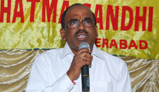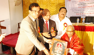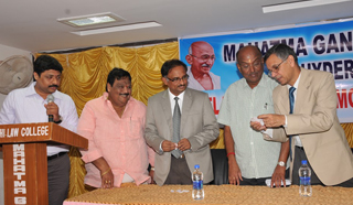 Eminent Professor of Law and Advocate Solicitor, Republic of Singapore, Prof. Lakshmikanth Rao Penna, being felicitated by Hon'ble Justice A. RajaShekar Reddy and Hon'ble Justice G. Chandraiah during the release of book “ Law and Social security in India” written by Prof (Dr) K. Vishnu Moorthy Founder Principal of this college, held at Mahatma Gandhi Law College.